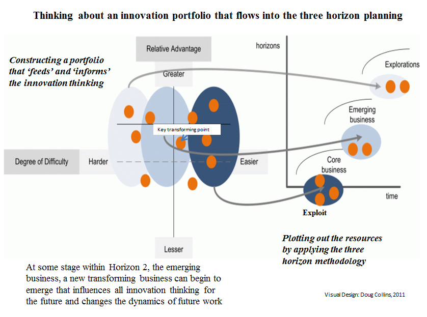 The potential of using the three horizons to any blue sky thinking, or determine what makes up the portfolio, is a more classic positioning but why not, once you have determined your opportunities in the portfolio you place them back into the three horizons to manage them ‘going forward’.