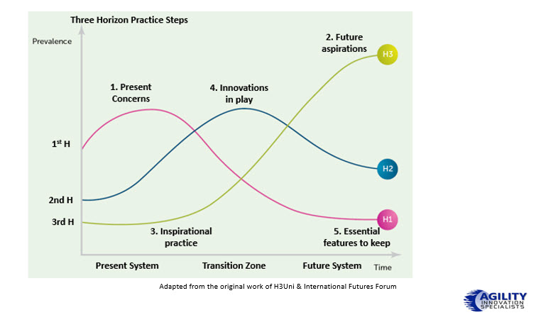 You might recall, the aim of understanding the 3H is to recognize differences between horizons; H1 is often seen as the prevailing or dominating system and what it needs to deal with for sustaining those parts that have value, validate the purpose or need a “refit” as the external environment changes over time. With H3 there is a need to build the desired future state, the ideal system we believe will transform and allow us to grow and then begin to explore the options of what and how we get there.
