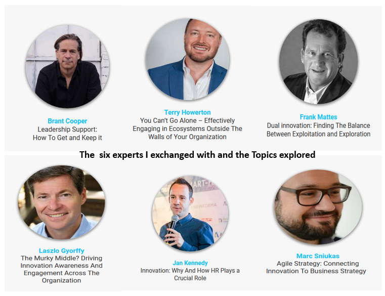 I had the delight of working on SIX key topics with a terrific group of knowledgeable people. I gained from the exchanges, it generated such terrific insights, ideas, and triggers to lift up my understanding and help me ‘fill in’ my questions and set me some of my own challenges for next year. They really did discuss different topics that are often top of mind for all innovators, intrapreneurs, and teams tackling innovation. The value also becomes one of those not working in the innovation space but have direct responsibility or simply curiosity on different parts of the innovation story will gain immeasurably from registering and attending this virtual summit.