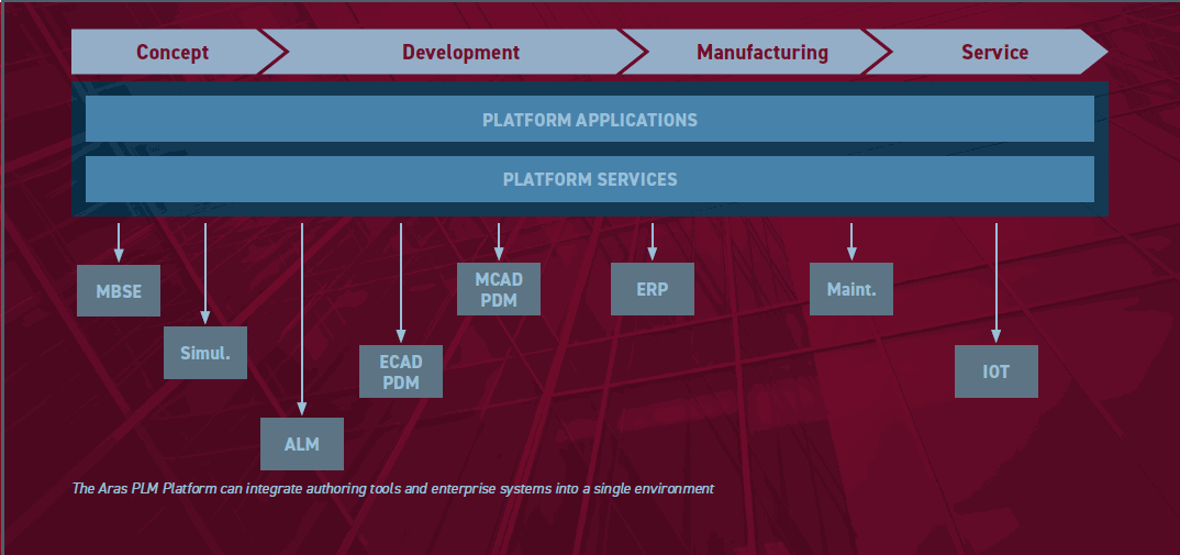 Aras provides a range of services that sit on the platform allows for dynamic workflows, plenty of visual collaborations, reporting all in different variants to fit your (entire) business, not one specific part, choosing separate solutions.