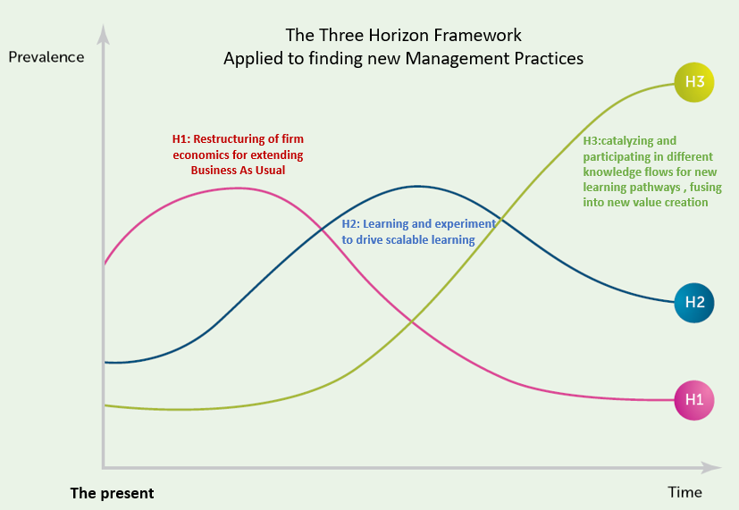 For horizon three (the future need) we need to develop new management practices to be effectively catalyzing and participating in different knowledge flows, fusing what is gained into new value creation, reducing friction and barriers, constantly refreshing and extracting from the relevant knowledge flows that provide scalable learning pathways.