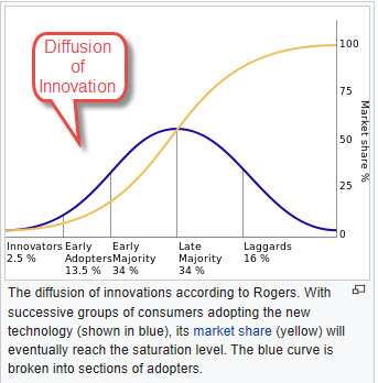 Rogers also discusses the adopter profiles familiar to many of us, early adopters, through to late majority to be the process of diffusion (see above). The critical point here is the process of diffusion needs to be well-managed as the process of development