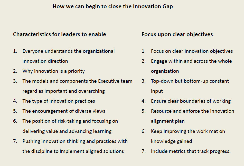 As I mentioned earlier it is getting innovation into this ‘choice mentality’ on where to play and what seems to be the real wins by providing as much understanding of the judgment of why it contributes to the strategic goals. You align it or ‘flag’ it. To get innovation to align you need to discuss a whole array of gaps. It needs dialogues, engagement and a clear, cohesive set of ‘shared’ objectives of what innovation can make a contribution and deliver a difference.