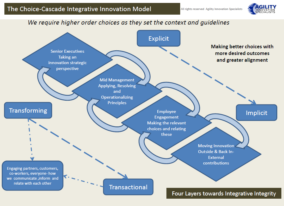 Today, if we recognize change is a constant, flowing and rapidly changing part of how we do business, by having in place this choice cascading model you can unfreeze part of a strategy that is not ‘aligning’ with a changing world. It makes the decision-making process more dynamic and allows for greater contribution to strategic choices and the innovation process can equally respond and align on a far quicker, adaptive path.