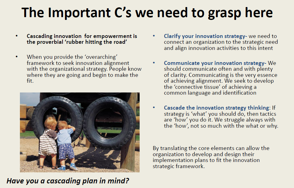 Having a cascading model in place allows that essential ‘flow’ that connects innovation to strategy but more importantly becomes the connecting point for all within the organization to identify with and…..align too.