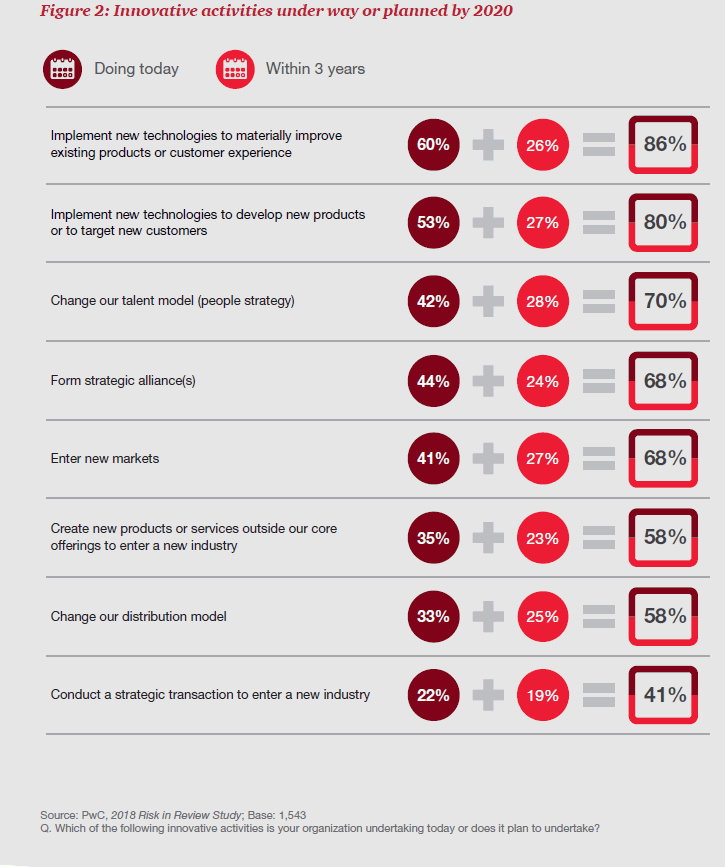 Recently I re-read a recent PwC report “Managing risks and enabling growth in the age of innovation” as they continued to periodically give risk an innovation focus. We need more reports on innovation and risk. I can recall two or three reports they produced around this ‘risk and innovation’ theme over the years, happily sitting in my taxonomy of innovation, always useful to refer too. This latest one had an opening theme about innovation being described in more revolutionary terms such as part of the fourth industrial revolution, the second machine age, the cognitive age and this is adding more pressure to innovate or search for “greater innovation within companies.