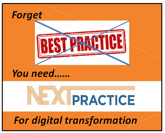 The digital transformation that is underway is becoming a very uncomfortable place. We are all presently learning a new practice. The past best practices are now a very poor playbook for the future digital connected world. We need to ditch much of the endeavors that make up a legacy of past practice, and think forward, to which the term next practice becomes the learning spot.