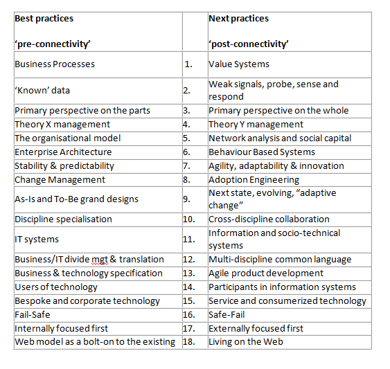 This emerging shift in leadership techniques, from best to next practice, from pre-connectivity to post-connectivity, are shown here: