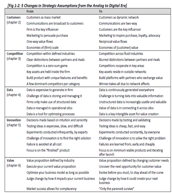 The second contribution into thinking next practice comes from a really promising book by David L Rogers called “the Digital Transformation Playbook”, recently published in April 2016, and he is offering a superb list of changes to consider as we move from the Analog to the Digital Era.