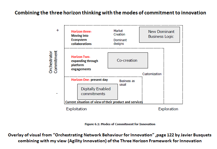 It takes the 3H framework into the very need of today, developing the thinking of each of the three horizons to work towards our transformation from the solo organization offering (disconnected) products and services into ones that connect technology by platform participation and ecosystem exploration for greater innovation. Here is my adapted visual and opens up my thinking even further.