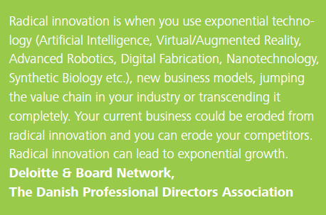 In a recent report called “Radical Innovation and Growth: Global Board Survey 2016 ” (link opens the pdf) we have results from a survey jointly conducted by Deloitte Denmark and Board Network – The Danish Professional Directors Association, that opens up much that can concern us about the current boardroom and its great difficulty with managing more radical innovation.