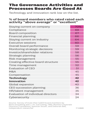 To quote “When we asked directors about the effectiveness of their board’s processes for supporting innovation, 42% rated their processes as above average or excellent. In contrast, 70% of respondents think their boards have effective processes for staying current on the company”