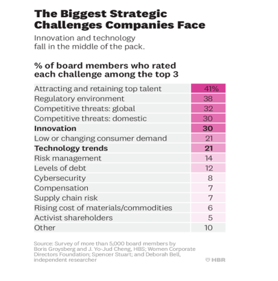 Innovation is well behind many other issues being focused upon by directors. The survey exposes the myth that innovation is not one of the three top challenges, innovation ranks fifth as it follows the more conventional concerns of managing talent as the top (and that did surprise me) and regulatory and competitive threats. Technology trends lay in the seventh position in this “biggest strategic challenges.”