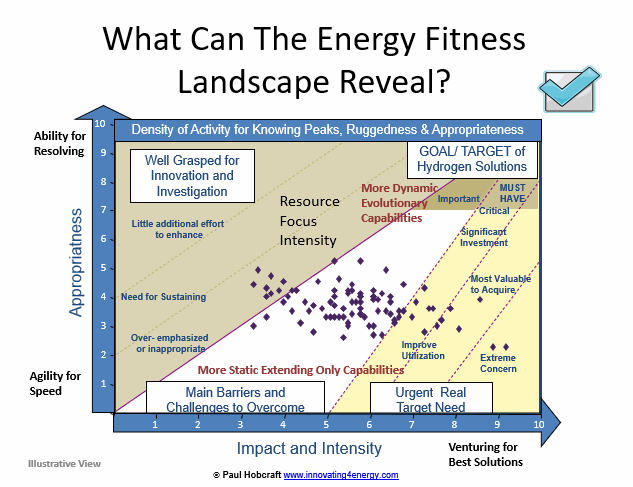 Fitness Landscapes helps in this task by identifying the opportunity spaces on where you need to focus your efforts‐ and apply the appropriate resources to navigate the terrain. The greater understanding of the ‘fitness points needed’ can transform your hydrogen landscape potential, or in business parlance, achieve your goal.